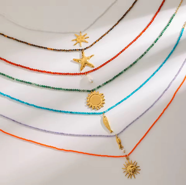 Este collar Belice es ideal para el verano playero, con dijes que evocan el mar y la naturaleza: pez, flor y sol, montados en cadenas de colores. Su diseño resistente complementa cualquier look veraniego, aportando un toque fresco y duradero. Perfecto para quienes buscan combinar estilo y funcionalidad.