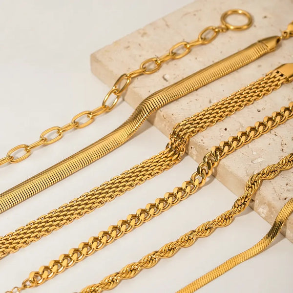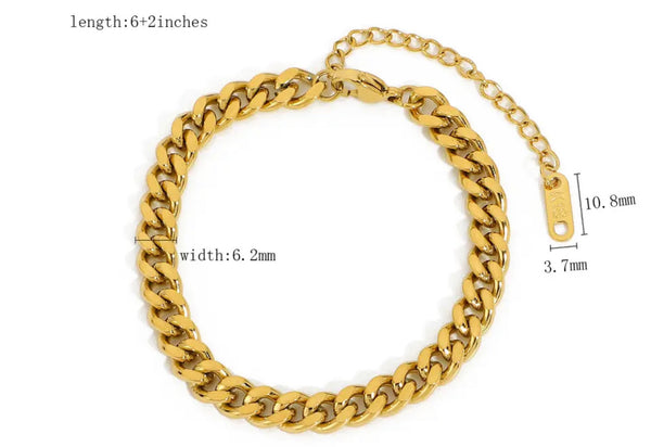 La pulsera Clematis presenta una cadena mediana de estilo chunky en acero inoxidable dorado, que garantiza durabilidad y resistencia al desgaste. Su diseño robusto y elegante aporta un toque contemporáneo y sofisticado, ideal para complementar cualquier look con un acabado moderno y refinado. Perfecta para uso diario, combina comodidad con estilo experto.